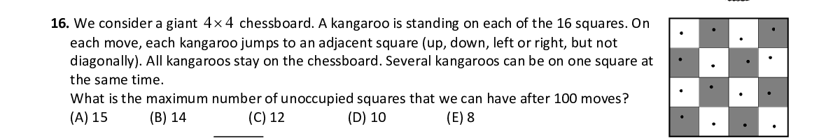 Q16. We consider a giant 4 4 chessboard. A kangaroo is standing on each of the 16 squares. On each move, each kangaroo jumps to an adjacent squar e (up, down, left or right, but not diagonally). All kangaroos stay on the chessboard. Several kangaroos can be on one square at the same time. What is the maximum number of unoccupied squares th at we can have after 100 moves?