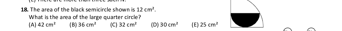 Q18. The area of the black semicircle shown is 12 cm². What is the area of the large quarter circle?