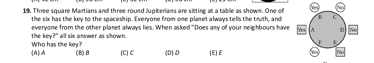 Q19. Three square Martians and three round Jupiterians a re sitting at a table as shown. One of the six has the key to the spaceship. Everyone from one planet always tells the truth, and everyone from the other planet always lies. When as ked "Does any of your neighbours have the key?" all six answer as shown. Who has the key?