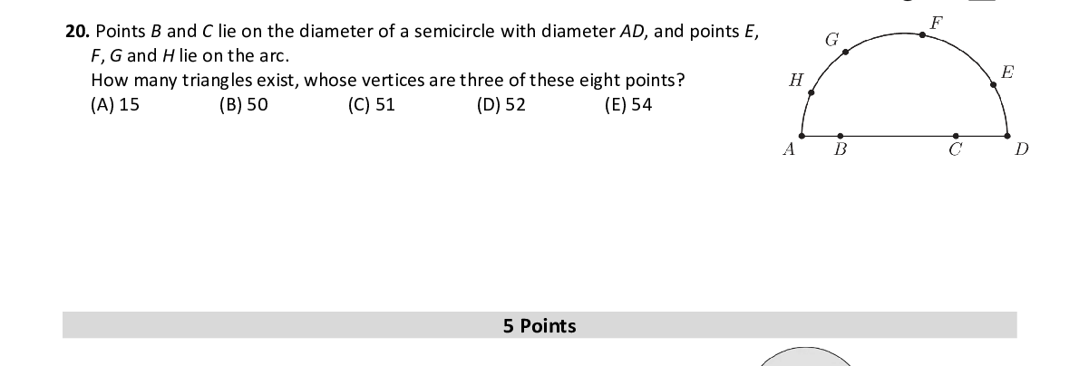 Q20. Points B and C lie on the diameter of a semicircle with diameter AD , and points E , F , G and H lie on the arc. How many triangles exist, whose vertices are three of these eight points?