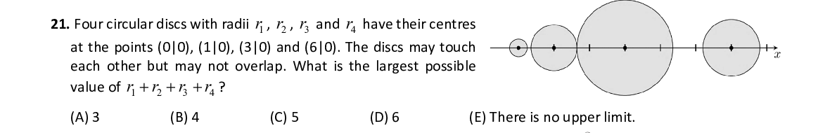 Q21. Four circular discs with radii r 1 , r 2 , r 3 and r 4 have their centres at the points (0|0), (1|0), (3|0) and (6|0). The di scs may touch each other but may not overlap. What is the largest possible value of r 1 r 2 r 3 r 4 ?