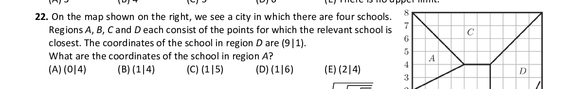Q22. On the map shown on the right, we see a city in wh ich there are four schools. Regions A , B , C and D each consist of the points for which the relevant school is closest. The coordinates of the school in region D are (9|1). What are the coordinates of the school in region A ?