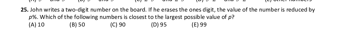 Q25. John writes a two-digit number on the board. If he erases the ones digit, the value of the number is reduced by p %. Which of the following numbers is closest to the largest possible value of p ?