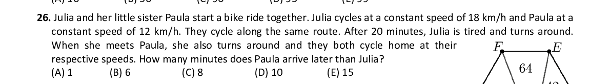 Q26. Julia and her little sister Paula start a bike rid e together. Julia cycles at a constant speed of 18 km/h and Paula at a constant speed of 12 km/h. They cycle along the sam e route. After 20 minutes, Julia is tired and turns around. When she meets Paula, she also turns around and the y both cycle home at their respective speeds. How many minutes does Paula arri ve later than Julia?