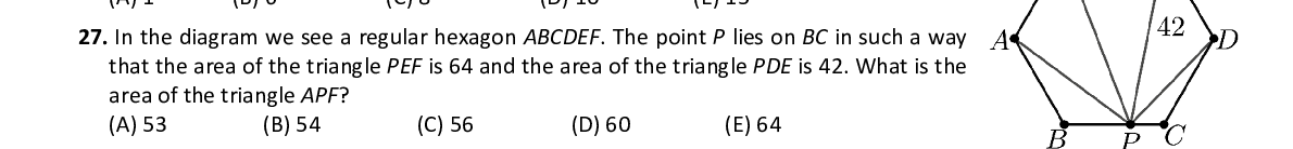 Q27. In the diagram we see a regular hexagon ABCDEF . The point P lies on BC in such a way that the area of the triangle PEF is 64 and the area of the triangle PDE is 42. What is the area of the triangle APF ?