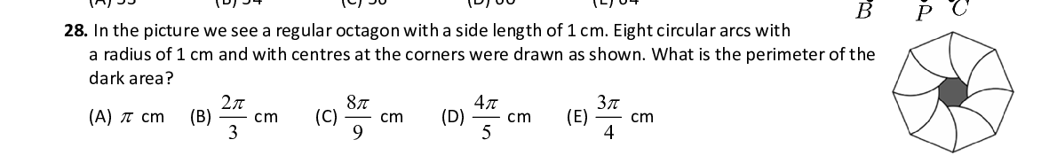 Q28. In the picture we see a regular octagon with a sid e length of 1 cm. Eight circular arcs with a radius of 1 cm and with centres at the corners we re drawn as shown. What is the perimeter of the dark area?