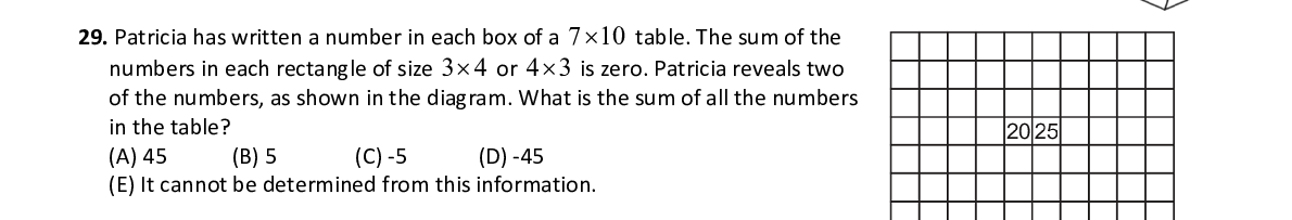 Q29. Patricia has written a number in each box of a 7 10 table. The sum of the numbers in each rectangle of size 3 4 or 4 3 is zero. Patricia reveals two of the numbers, as shown in the diagram. What is th e sum of all the numbers in the table?
