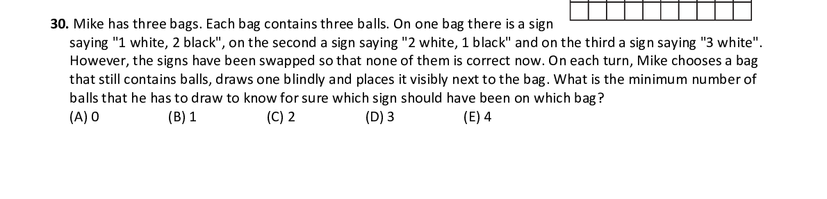 Q30. Mike has three bags. Each bag contains three balls. On one bag there is a sign saying "1 white, 2 black", on the second a sign say ing "2 white, 1 black" and on the third a sign sayi ng "3 white". However, the signs have been swapped so that none o f them is correct now. On each turn, Mike chooses a bag that still contains balls, draws one blindly and pl aces it visibly next to the bag. What is the minimu m number of balls that he has to draw to know for sure which sig n should have been on which bag?