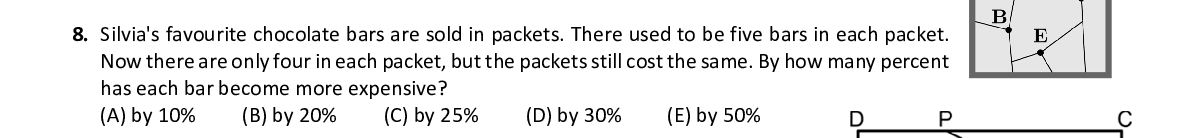 Q8. Silvia's favourite chocolate bars are sold in packe ts. There used to be five bars in each packet. Now there are only four in each packet, but the pac kets still cost the same. By how many percent has each bar become more expensive?