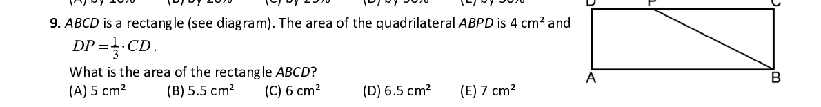 Q9. ABCD is a rectangle (see diagram). The area of the quad rilateral ABPD is 4 cm² and